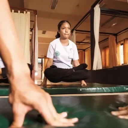 A unique feature of traditional Thai massage that distinguishes it from any other type of massage is precisely the combination of rhythmic acupressure, deep compressions, and guided yoga-like body maneuvers. Though considering possible complications, its standardized protocols for treating back disorders and injuries always consist primarily of pressing steps, with only a few stretching and with no bending backward. For patient safety, the procedure is conducted in a lying but not in a sitting position.