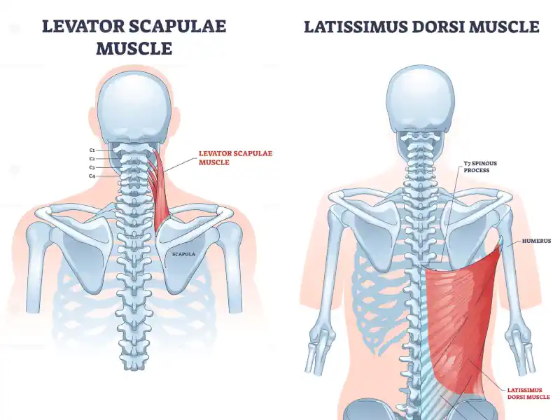 - Levator Scapulae: Often overworked, hiking shoulders to ears. Work from scapula attachment up to vertebrae.