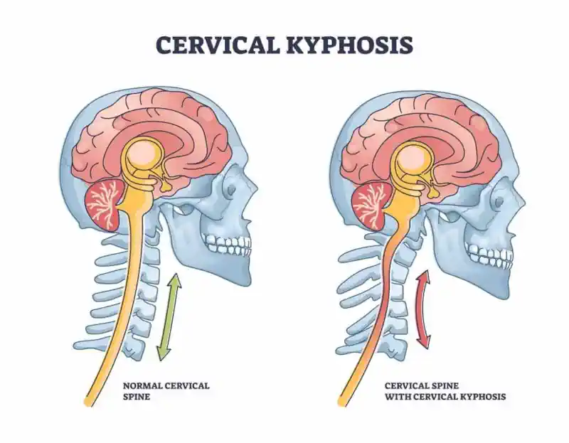 When “turtle neck” and slouching (cervical kyphosis) persist for years, your body builds protective mechanisms. The seventh cervical vertebra starts protruding more prominently. To shield it, your body piles on connective tissue and fat there—forming the “dowager’s hump” or “buffalo hump.” Surrounding fascia stays in chronic inflammation, leading to adhesions and hardening.