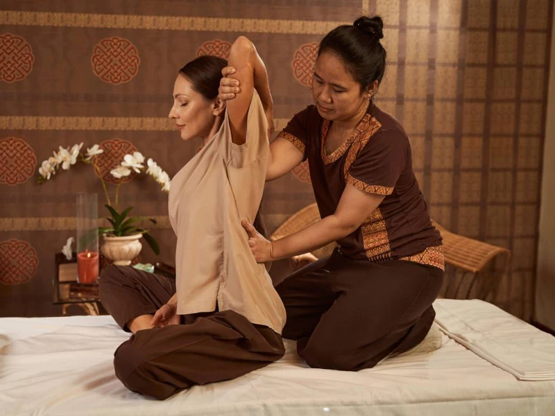 Traditional Thai massage is known for being a little firm, compared to typical Western modalities. It involves stretching, rocking, and compressing the receiver’s body, which may be stepped on, kneed, elbowed, and placed into strenuous and constantly shifting positions. These body manipulations are particularly aimed at relieving tension in muscles and joints and improving their ability to move through a wide range of motion.